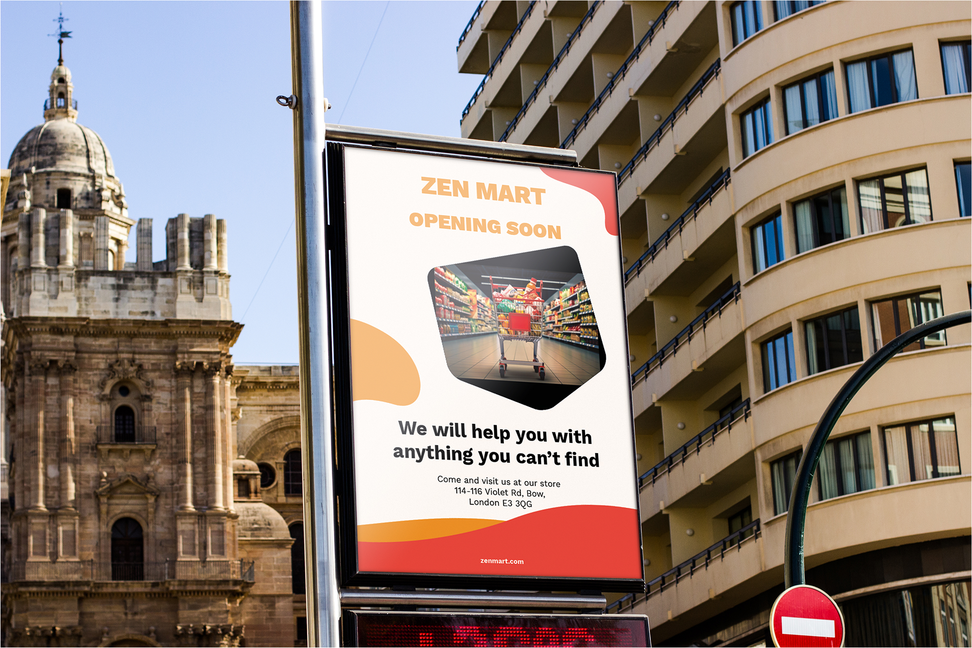 A opening soon poster for a company rebrand called Zen Mart which was originally tesco.